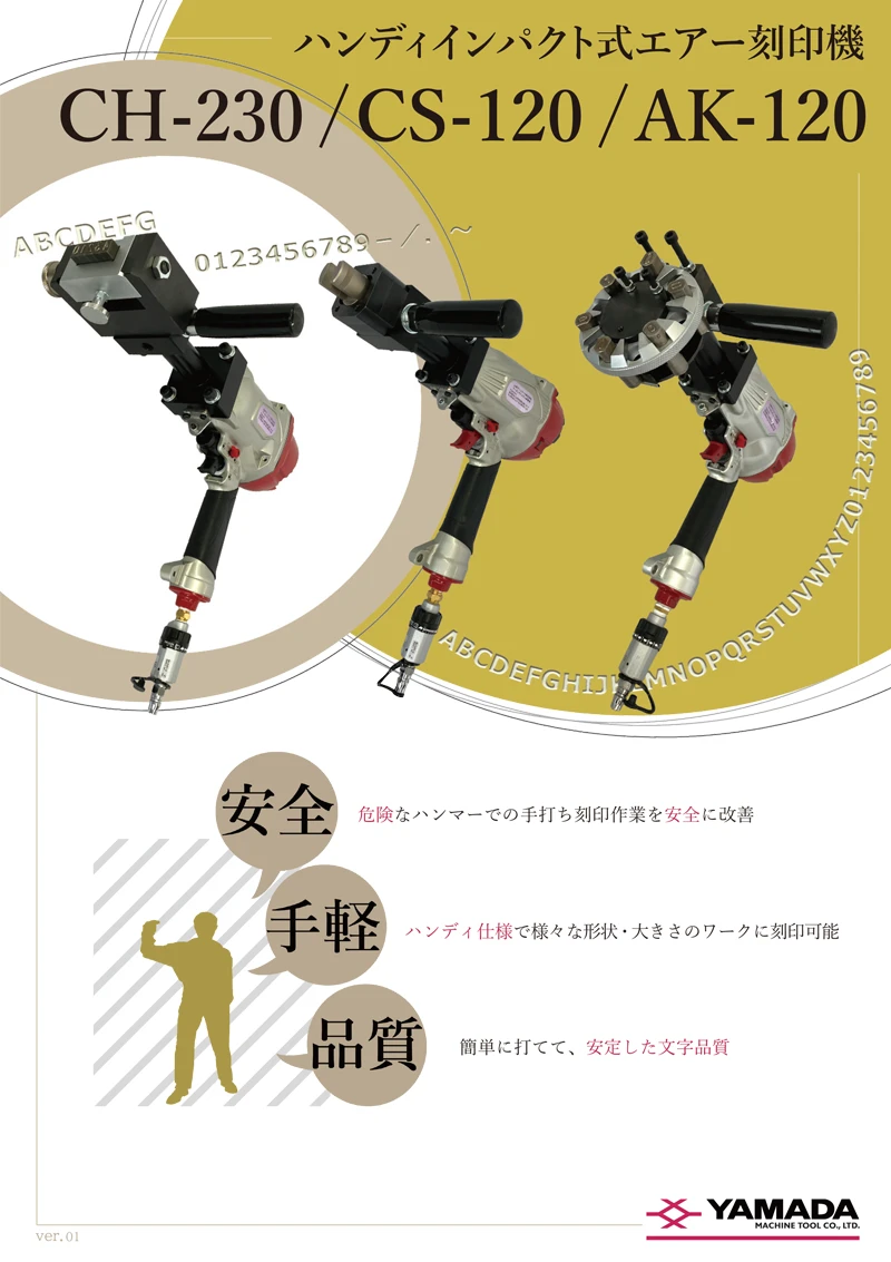 CS-120はエアーの力で刻印を1文字打刻するツールです。 手打ち刻印の場合、作業者の熟練度により品質のバラつきやケガのリスクがあります。CS-120を使うことにより誰が打刻しても高品質でバラつきの出ない打刻が可能です。