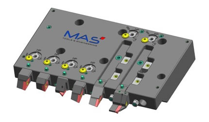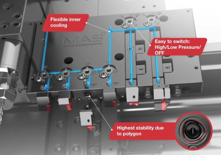 ギャングプレートは内部給油方式に対応しています。プレートの内部にクーラント回路を作ることで、面倒で手間がかかるバイトごとのホースや継ぎ手の接続が不要になります。高圧/低圧切替スイッチをつけることも可能なので、予めクーラント回路を2種類準備しておけば、加工内容にあわせて工具ごとにどちらの回路を用いるか選択することができます。