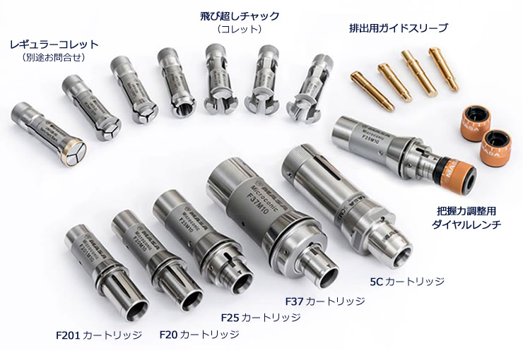 カートリッジ、コレット、ダイヤルレンチ、排出スリーブ