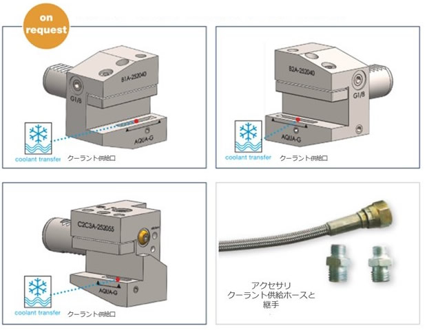 AQUA-Gなどの底面クーラント供給対応ホルダと組み合わせて使用することで、ホース無しでの接続が可能となります。