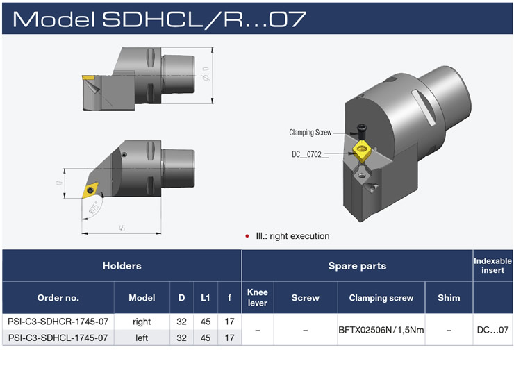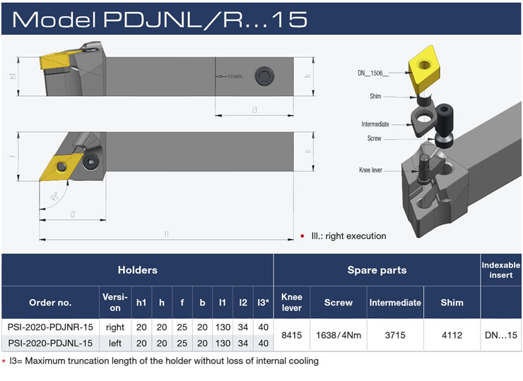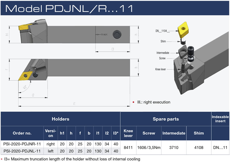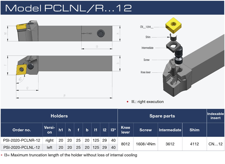 PSIターンは内部給油加工によって加工工程を安全に進めて生産性を上げる為に開発されました。 逃げ面とすくい面の二方向から刃先を狙って的確にクーラントを供給できるので、切り屑の除去を容易にしたり摩耗抑制の効果が期待できます。ヘッド部をできるだけコンパクトに設計してあり、切り屑が巻きつくリスクを低減しています。