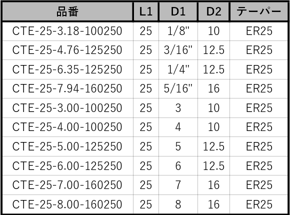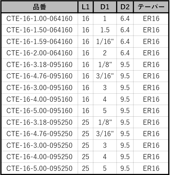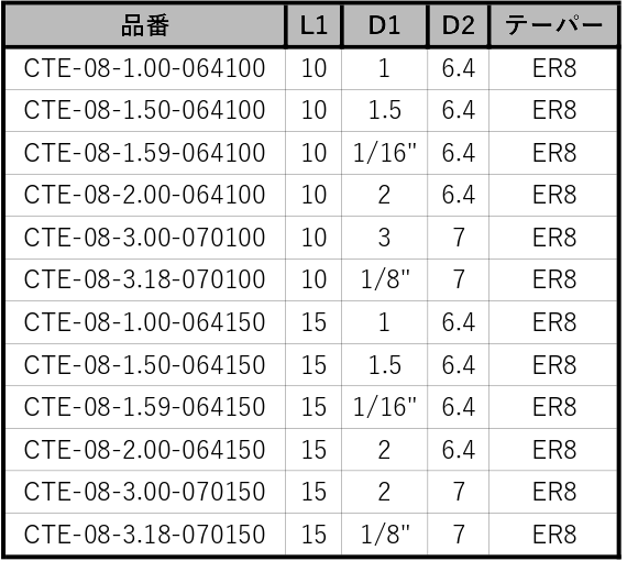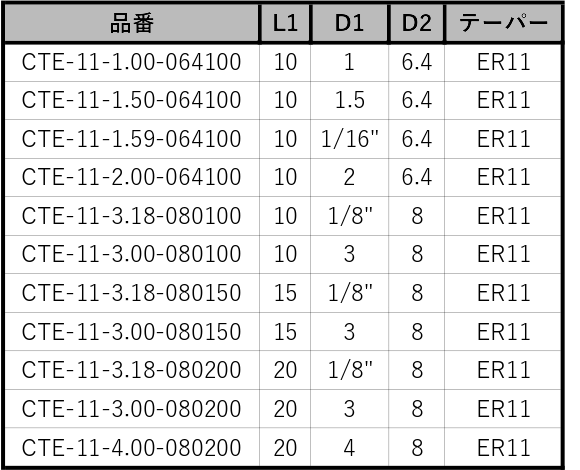 | 品番 | シャンクサイズ | コレットサイズ | 延長長さ |