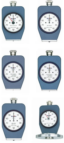 一般ゴム用(タイプA)、硬質ゴム用(タイプD)、軟質ゴム用(タイプE)とJIS K 6253(新JIS)に対応しているデュロメータ以外にもスプリングの強さと各種測定子の組合せにより硬質ゴムから食器用スポンジの硬さまで測ることができます。