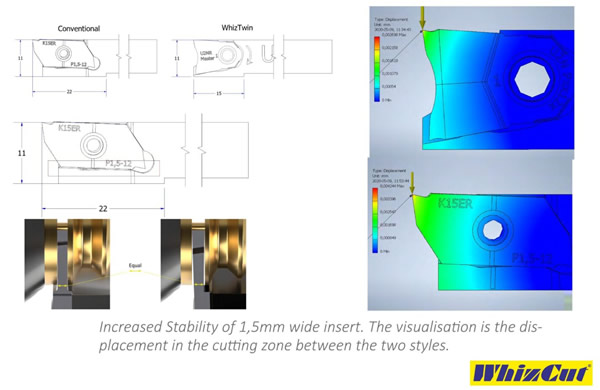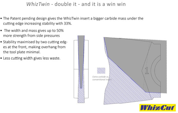 突っ切り加工工具の剛性をあげれば刃幅を細くできる。そうすれば切り屑として材料を無駄にしなくてよくなるのではないか。そんな発想からウィズツインは開発されました。