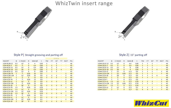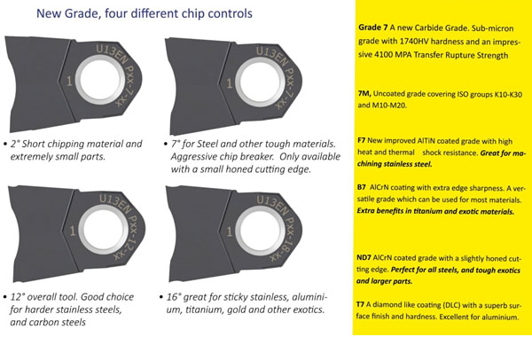 突っ切り巾は最小0.3から最大2.0mmまで、突っ切り加工なワーク外径は最大Φ13までのラインナップとなっています。